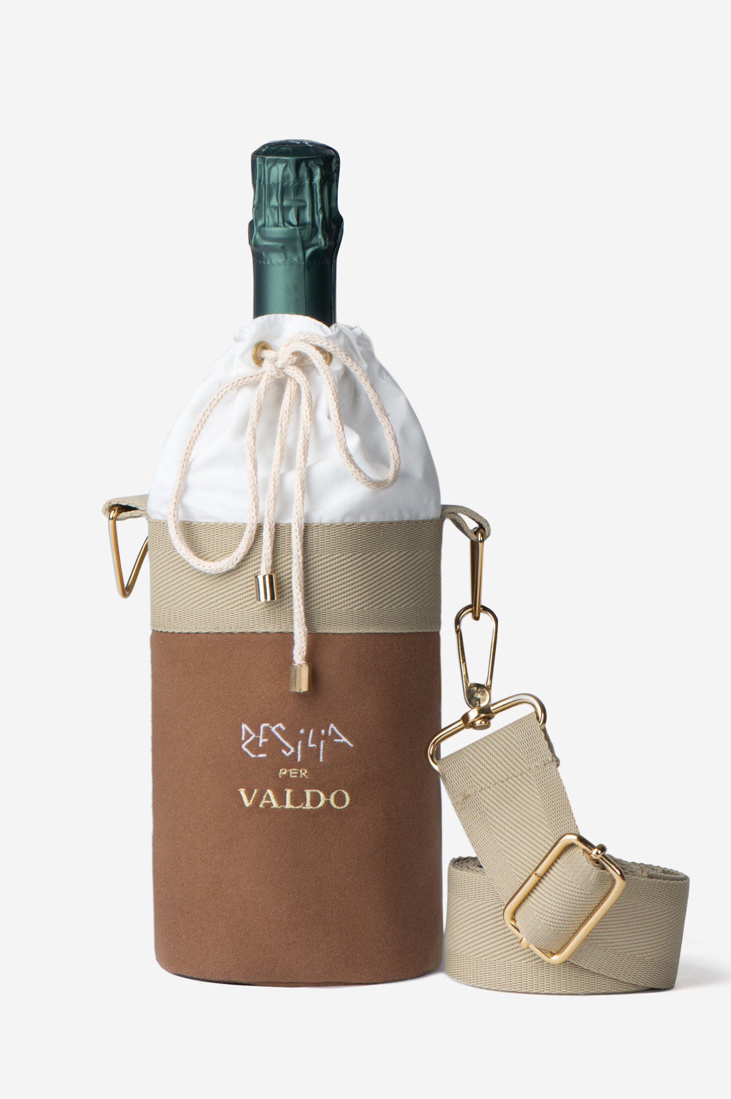La Bucket Bag Resilia x Valdo è stata progettata rivisitando l’iconica forma della borsa “a secchiello”. Il materiale principale dell’esterno è la saia di cotone, in color sughero, che ha una forma cilindrica con una base rotonda, ideale per la bottiglia; è foderata all’interno con una tela in cotone di colore bianco, l’imbottitura è di ovattina termo resistente, costituita da due strati di tessuto in modo da mantenere la temperatura del vino.