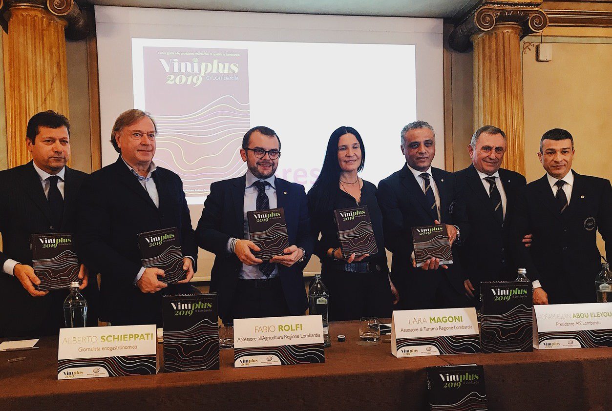 Lunedì 26 Novembre è stata presentata la nuova Guida Viniplus 2019, giunta ormai alla sua tredicesima edizione. Al tavolo dei relatori Hosam Eldin Abou Eleyoun, Presidente AIS Lombardia, Fabio Rolfi, Assessore Agricoltura Regione Lombardia, Lara Magoni, Assessore al Turismo, Alfredo Zini, Presidente Imprese Storiche, Alberto Schieppati, giornalista enogastronomico, Luigi Bortolotti, responsabile degustatori AIS Lombardia e Sebastiano Baldinu, curatore Guida Viniplus 2019.
