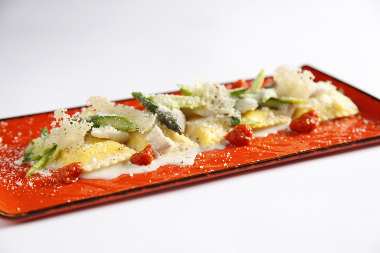 RAVIOLI RIPIENI con Pecorino Romano DOP, cremoso al pomodoro, salsa orata e asparagi