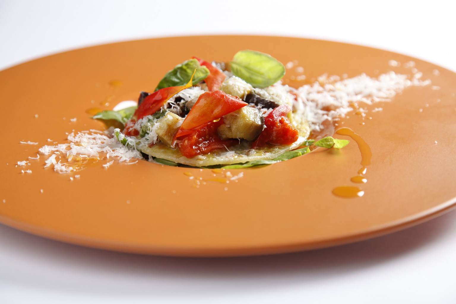 Finitura e presentazione: Posizionare il chapati ancora caldo su un tagliere e tagliarlo in sei spicchi, poi, su un piatto da portata, condire ogni spicchio con la crema di pomodori, le melanzane, i fiocchi di Pecorino Romano DOP ed il basilico