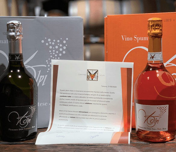 Un cartone da 6 bottiglie di Piemonte DOC Pinot Nero Rosé e uno da 6 bottiglie di Piemonte DOC Cortese Spumante in omaggio ad oltre 100 attività HORECA del tortonese. E’ la ripartenza di Cantine Volpi – una delle principali realtà produttive ed imprenditoriali dei Colli Tortonesi – che crede fortemente nel suo territorio e al ruolo che la ristorazione può giocare per favorirne il rilancio. Ognuna delle 130 attività – bar, pub e ristoranti – mappate da Marco Volpi, quinta generazione, da poco entrato in azienda e promotore di questa iniziativa, riceverà le 12 bottiglie senza alcun vincolo. In totale oltre 1500 bottiglie che ogni esercizio del territorio potrà inserire nella propria offerta e che potranno generare una potenziale entrata economica per l’insieme del canale Ho.Re.Ca. del tortonese.