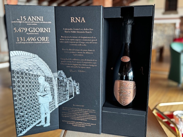 Proprio dall’amore e da un’intuizione di Alessandro Bianchi nasce un vino, ma ancora di più un progetto. Per il matrimonio di Roberta, il dono paterno fu la creazione di un Cru che potesse accompagnare tutto il pasto: “Cuvette Franciacorta Brut Millesimato”. “RNA – Riserva Nobile Alessandro”, oltre a racchiudere un profondo significato, è, soprattutto, l’omaggio di una figlia per il padre tanto amato, un tributo al suo straordinario impegno e alla sua sensibilità verso il territorio della Franciacorta. Un assemblaggio di Chardonnay 85% e Pinot Nero 15% ottenuti dalla più ferrea selezione dei mosti (solo mosto fiore) ed ulteriore selezione dei migliori vini base del cru Cuvette affinati in barriques per 8 mesi. Il tiraggio è stato eseguito nel maggio 2008 con successiva rifermentazione e presa di spuma in bottiglia con l’aggiunta di ceppi di lievito selezionati, maturazione sulla lisi delle cellule per oltre 15 anni. Periodici scatastamenti al fine di favorire il ritorno in sospensione e dissoluzione degli aromi della lisi.  Nel calice si presenta dorato chiaro luminoso, con un perlage fine e persistente. Nasce così un bouquet di grande complessità e di eccezionale fragranza. Al naso si apre con note dolci, miele di zagara e agrume candito, cedro, albicocca e piccoli frutti rossi, che si mescolano a note verdi come timo e origano disidratati, seguono accenni balsamici di menta bianca. Il sorso entra avvolgente e dirompente, verticale, fresco, sapido, di estrema eleganza, sottile, ma lunghissimo.  Un Franciacorta nobile, come Nobile è il suo nome, frutto della grande potenzialità del terroir, associato a pazienti e amorevoli cure.  Un vino dall’eleganza classica e senza tempo.