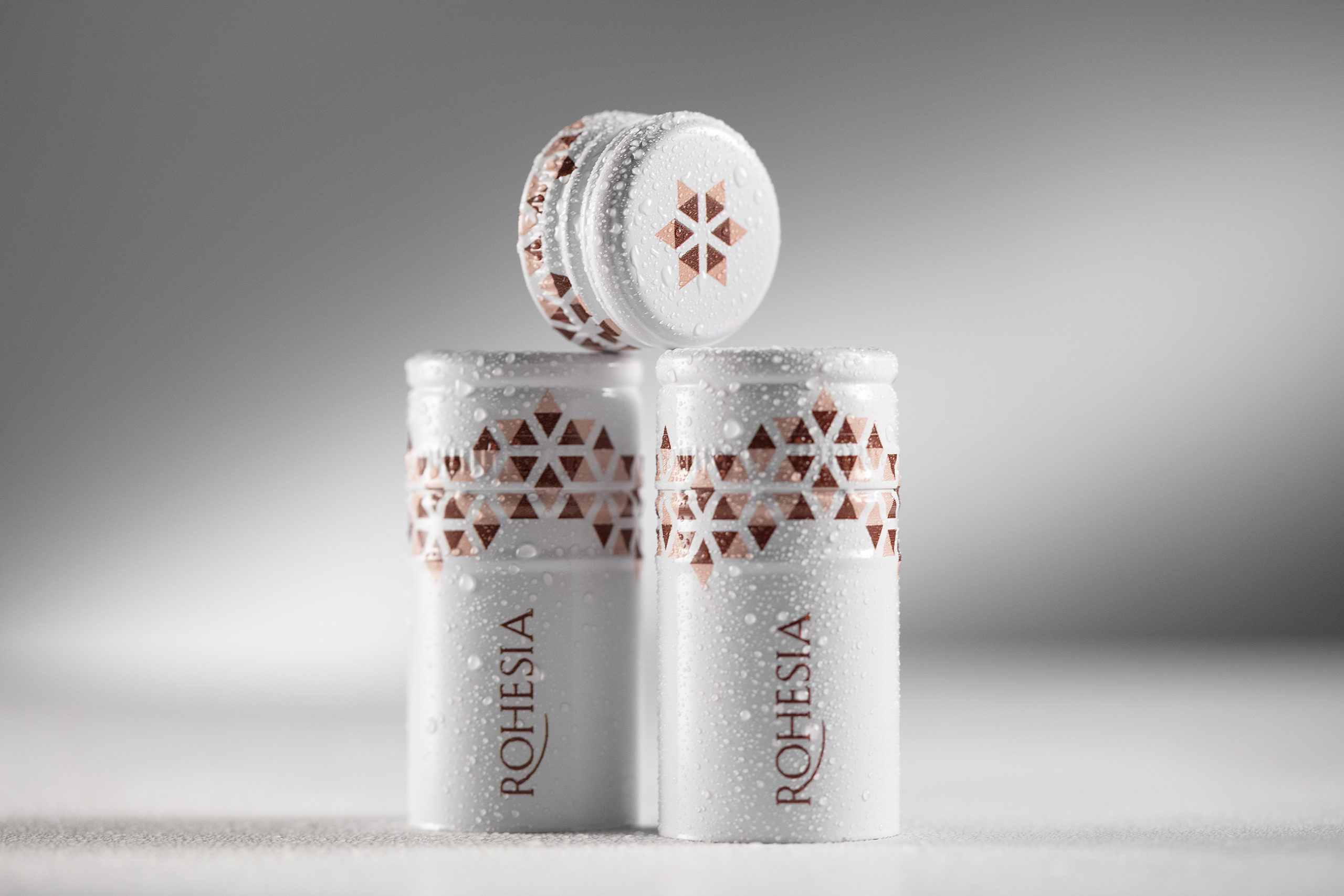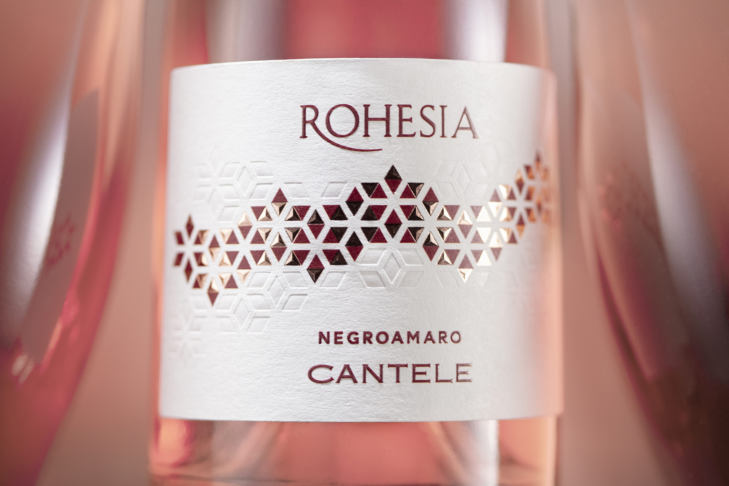 Con la nuova chiusura Rohesia presenta anche un restyling dell’eti­chetta eseguito dalla designer grafica pugliese Elisa Costa. La nuova immagine reinterpreta la rosa (a cui è ispirato il nome Rohesia, dal latino medievale), simbolo di bellezza ed eleganza, attraverso un pattern geometrico che non è solo un gioco di forme, ma una rappresentazione stilizzata del fiore. Ogni triangolo rappresenta il petalo di una rosa, simbolo di grazia e armonia, mentre le sfumature di rame e rosa evocano la luce calda del tramonto sulle vigne di Negroamaro, il cuore pulsante del Rohesia. I petali si intrecciano, come se danzassero al ritmo del vento che accarezza le pianure salentine, raccontando la storia di una terra ricca di tradizioni, passione e artigianalità. Il design moderno, fatto di linee nette e precise, rappresenta un nuovo modo di interpretare la tradizione: un equilibrio tra passato e presente, tra artigianalità e innovazione. Ed è una geometria viva che riflette la complessità e la struttura del vino, le sue note.