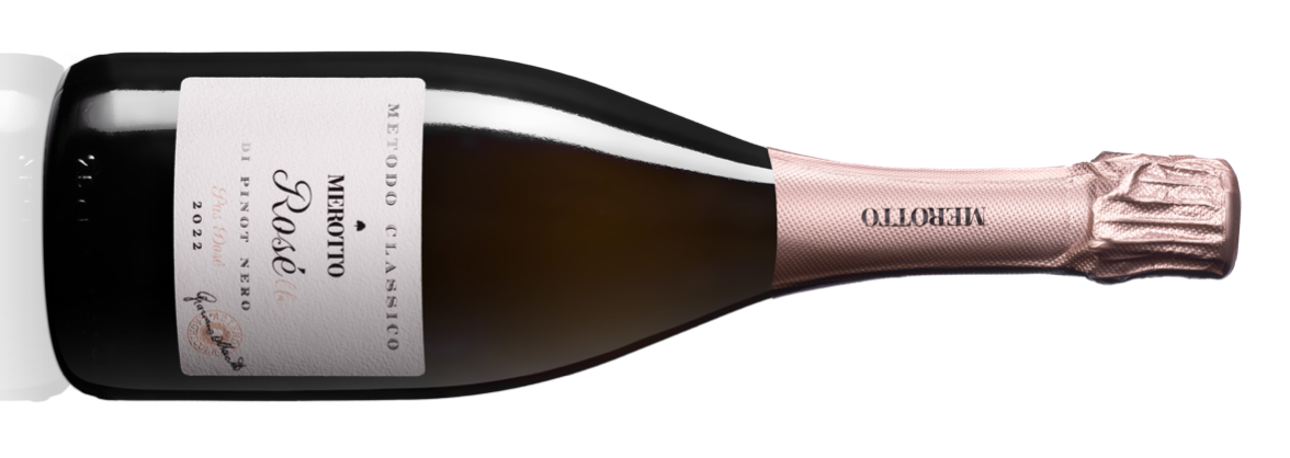 Merotto Metodo Classico Rosé Pas Dosé 2022 l’etichetta è dedicata a Rossella, preziosa compagna di vita e lavoro, di cui in etichetta si può leggere in sottofondo la desinenza del nome. Pinot Nero 100%, in tiratura limitata. Rosa antico nel calice, fragrante e caratterizzato da toni di pesca bianca, lampone, melograno, ribes, mela rossa, in sottofondo una delicata nuance speziata di pepe rosa. Sorso avvolgente, dotato di energia e profondità e una chiusura con sentori agrumati.