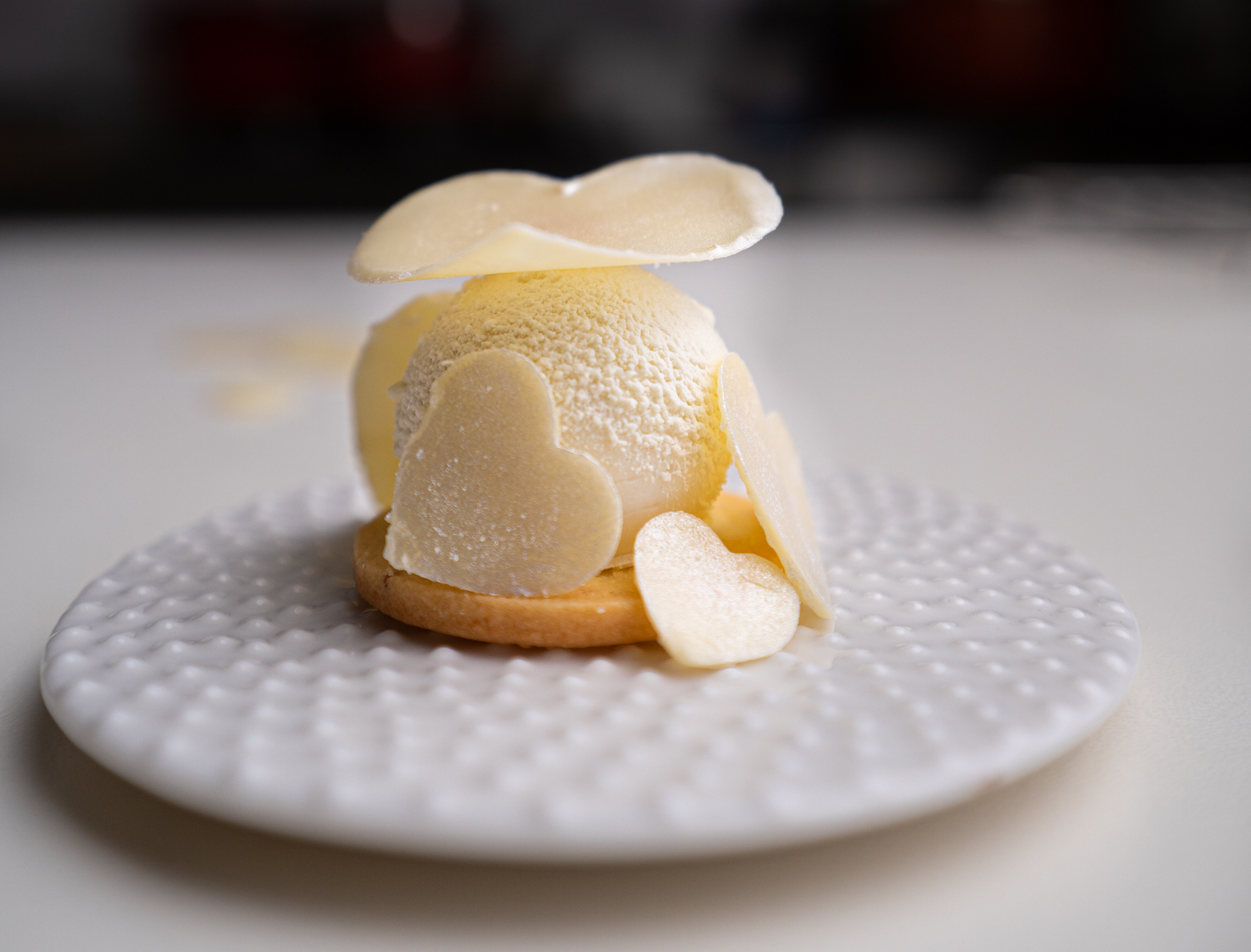 La Pastry Chef Annalisa Borella dedica a tutti gli innamorati una ricetta deliziosa e raffinata che ha intitolato: “So Lovely”: un boccone di mousse alla mandorla effetto velluto, su un Sablé al pepe sansho ed agrumi, con una decorazione di petali perlescenti di cioccolato bianco.