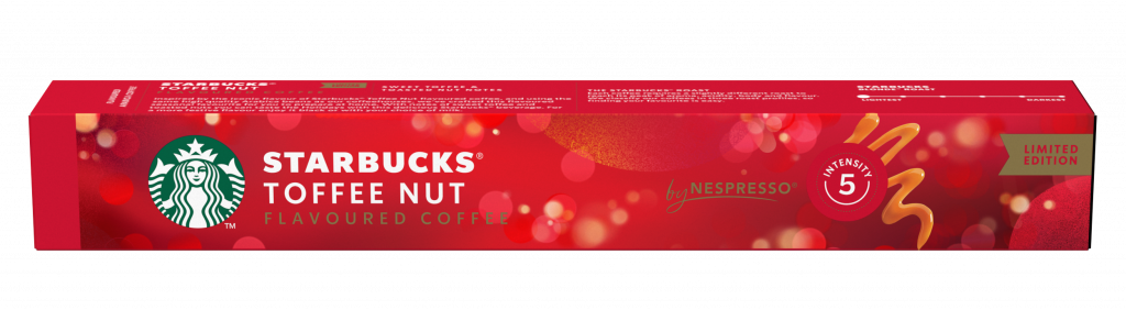 Starbucks® Toffee Nut by Nespresso® è un’esclusiva bevanda aromatizzata che ti conquisterà al primo sorso: realizzata con caffè 100% Arabica, con gli stessi chicchi utilizzati nelle caffetterie Starbucks® (intensità 5 su 12, tostatura chiara), offre un’esperienza unica grazie all’aroma di caramello e nocciole tostate, che si abbina perfettamente all’atmosfera allegra e scintillante delle festività.