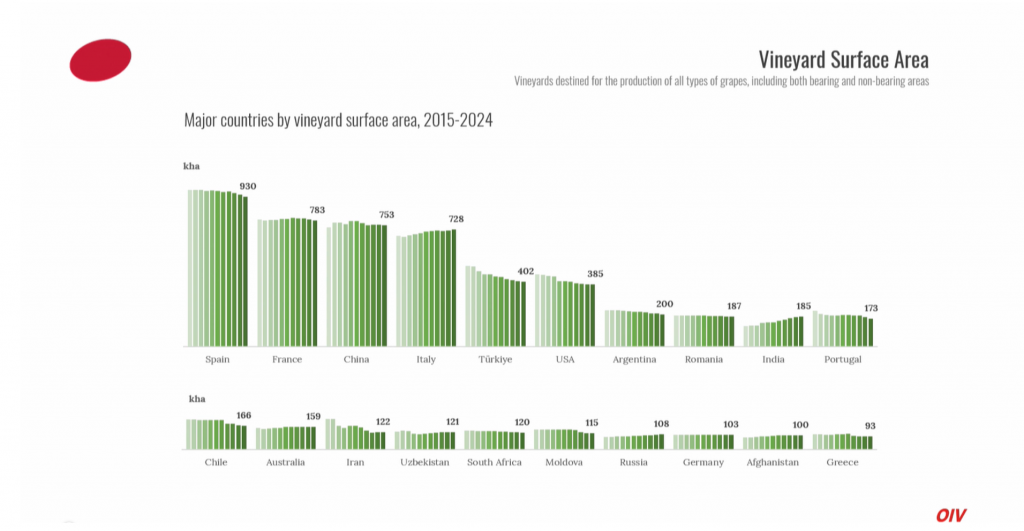 In tutto il mondo, complessivamente, la superficie vitata si è ridotta dello 0,6% rispetto al 2023, attestandosi a 7,1 milioni di ettari. Questa cifra include le viti piantate per tutti gli usi: uva da tavola, uva da vino, produzione di distillati, succhi di frutta, aceti. Si tratta del quarto anno consecutivo di riduzione in risposta a diversi fattori quali l’aumento dei costi di produzione e il cambiamento dei modelli di consumo.