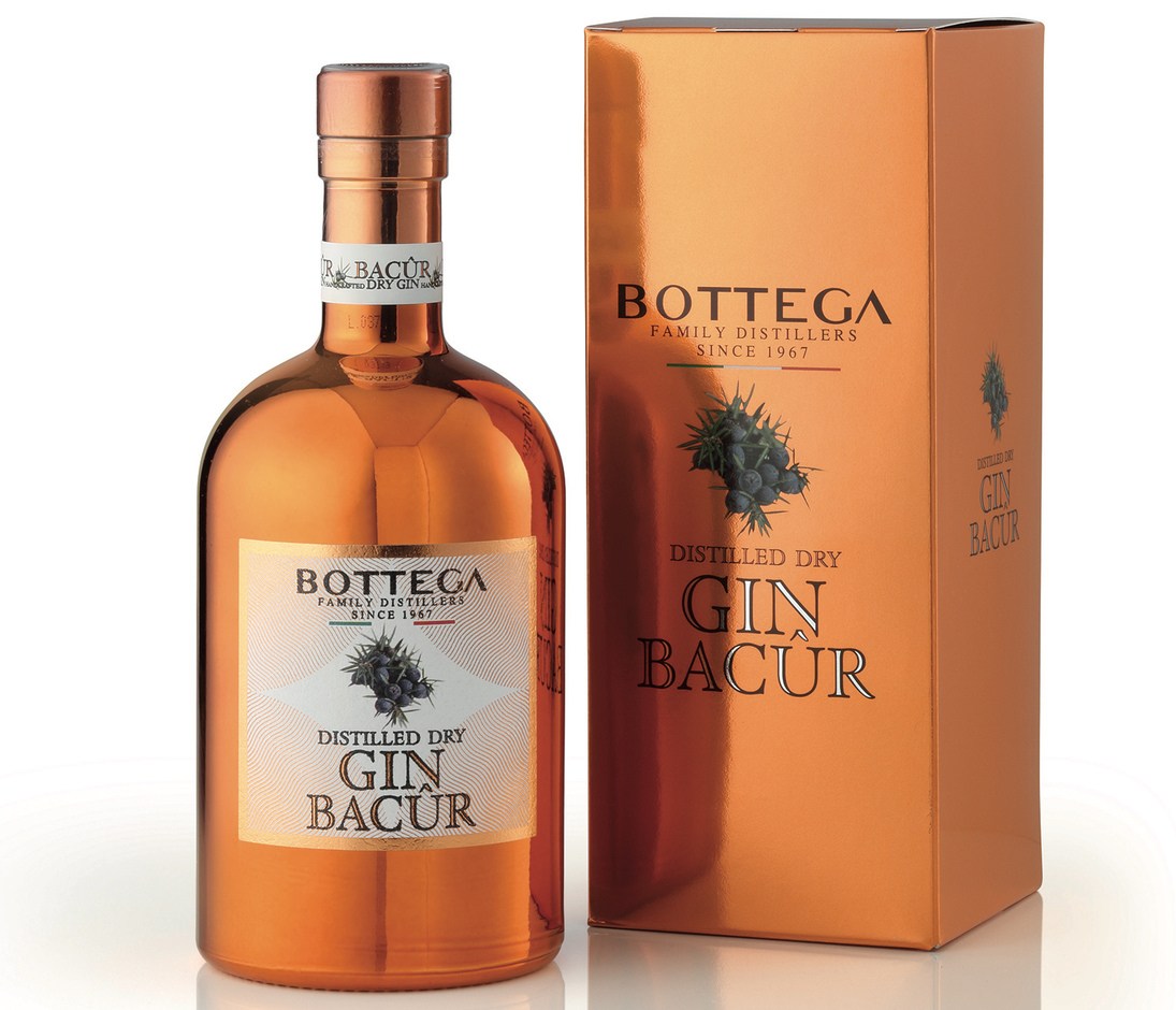 Gin Bacur Bottega è un Distilled Dry Gin, che sviluppa una gradazione alcolica di 40% vol. È caratterizzato dall’utilizzo di botanicals di origine certificata: bacche di ginepro (Toscana), salvia (Veneto) e scorze di limone (Sicilia). La sua qualità e la sua complessità dipendono non solo dal numero di piante, ma anche dalle condizioni di estrazione delle componenti aromatiche di ognuna di esse. Il packaging di grande impatto ha come punto di forza un’elegante bottiglia cilindrica metallizzata color rame. L’etichetta rettangolare bianca riproduce un rametto di bacche di ginepro e il logo Bottega, regalando all’insieme un’efficace contrasto cromatico. Il termine Bacûr, di derivazione preellenica, veniva anticamente utilizzato per indicare il rame. Gin Bacur Bottega è disponibile in bottiglia da 50, 70, 100 cl, in mignon da 5 cl e in versione Spray da 10 cl.