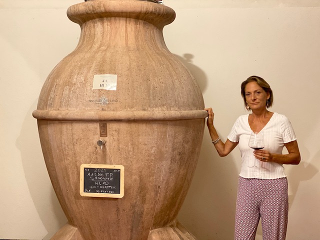 Mimesi è un “progetto di purezze”, un bianco e un rosso, rispettivamente un Vermentino e un Sangiovese, anfore di terracotta Tava per il primo e anfore di Cocciopesto Drunk Turtle per il secondo. Mimesi Vermentino trae il suo passo felpato dall’equilibrio delle stagioni 2020, mentre Mimesi Sangiovese ha ereditato la finezza di una maturazione lenta, nel 2018. Li distingue la loro identità, la loro annata, la loro fisionomia, mentre li accomuna una certa riservatezza espressiva nei convenevoli. Il nome significa “imitazione” nella filosofia di Platone, e indica il desiderio di imitare la natura, con la sua perfezione e il suo equilibrio. “Le due tipologie di anfora – spiega Ginevra Venerosi Pesciolini – sono state scelte per rispettare ed esaltare le caratteristiche intrinseche dei due vitigni, Vermentino e Sangiovese, esprimendo al meglio il territorio in cui nascono”. Il cocciopesto e la terracotta, grazie alla loro porosità regalano una lenta maturazione del vino e favoriscono la micro-ossigenazione.