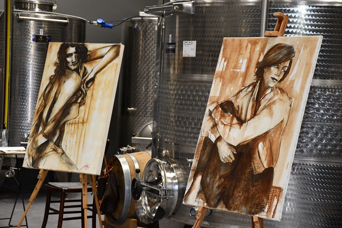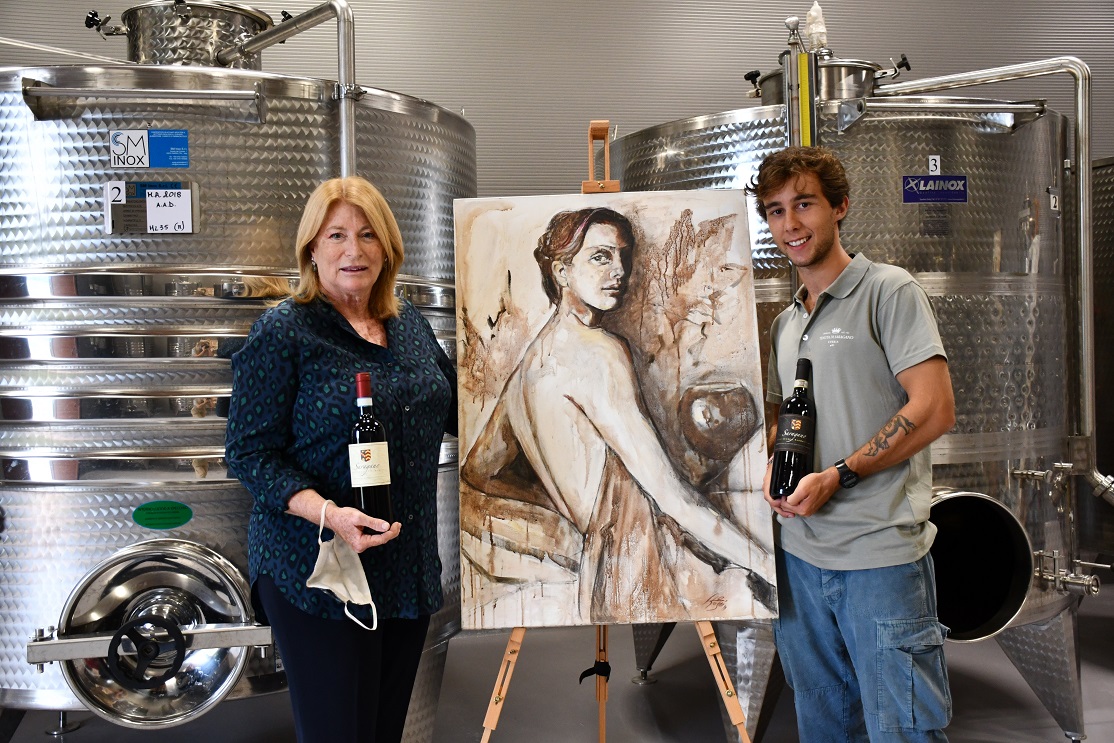 Il primo step del percorso è stata la mostra dei quadri dipinti da Elisabetta Rogai nella grande cantina della Tenuta, dove l’Artista ha raccontato ai tanti visitatori come è nata, nel 2011, la sua tecnica EnoArte, la sua curiosità che l’ha fatta avvicinare al mondo del vino e i successi di questa tecnica unica che l’hanno portata ad effettuare delle performance live nel mondo, in Cina, Usa, Grecia, Giappone.