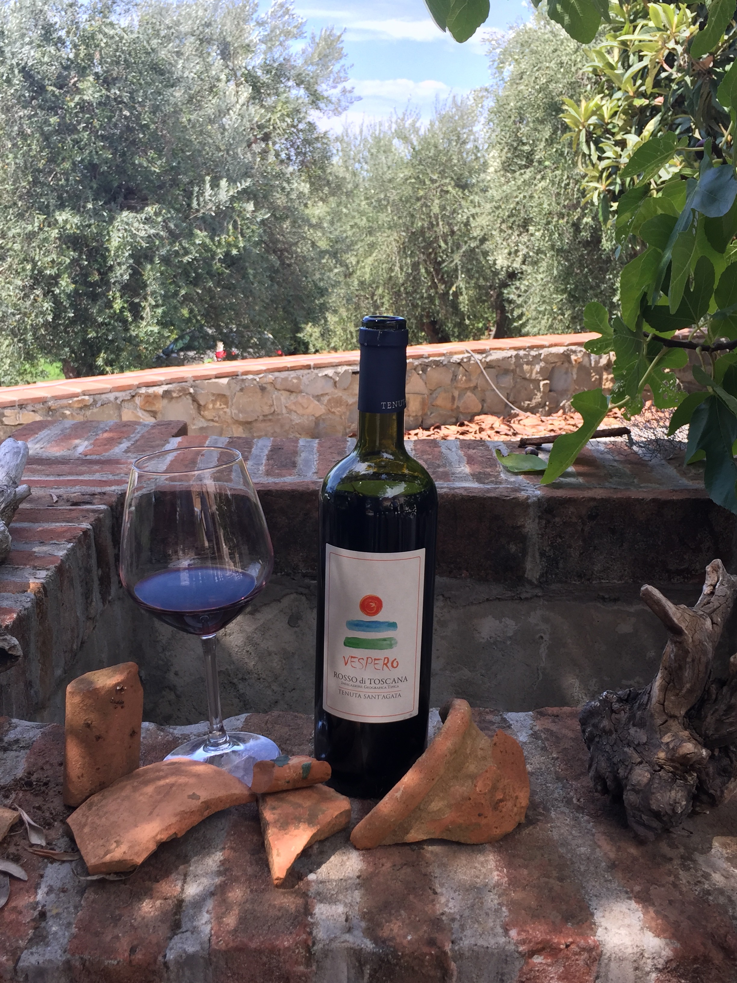 Con grande passione coltiva, in modo assolutamente tradizionale, 5 piccoli appezzamenti di terreno presenti nella Tenuta. Un ettaro e tre è dedicato alla vigna dalla quale ottiene una limitata ma ottima quantità di vino: Vespero bianco, Viognier e Chardonnay; Vespero rosso, Syrah e Cabernet Sauvignon, lasciato riposare in botti di rovere francese nuove e di II passaggio per 14 mesi; Tenuta Sant’Agata Rosso DOC Bolgheri, 90% tra Cabernet Sauvignon e Franc e 10% Syrah,18 mesi di affinamento tra barriques nuove e di secondo passaggio; Tenuta Sant’Agata Rosato DOC Bolgheri, ultimo uscito e stesso uvaggio del Bolgheri doc. Vini biologici dalla vendemmia 2013 che si sposano e accompagnano benissimo i piatti tipici della tradizione.