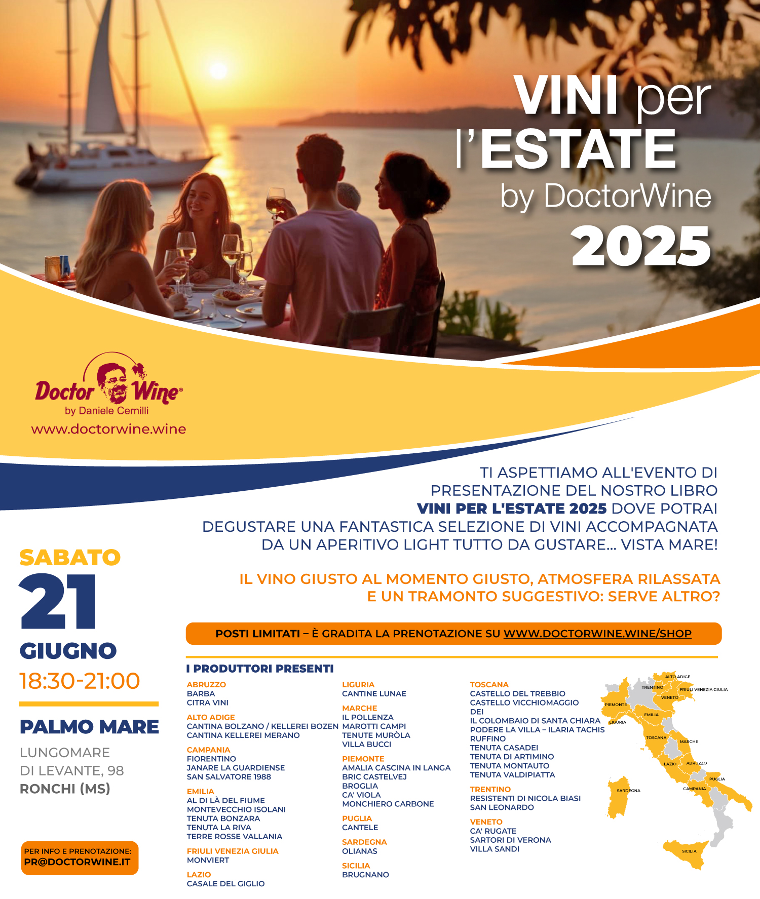 Un evento esclusivo con ingresso gratuito su prenotazione , dove sarà possibile degustare una selezione di vini presenti nella guida accompagnati da finger food in perfetto stile estivo, nella suggestiva e rilassata atmosfera del mare al tramonto. Tra i banchi d’assaggio, oltre 40 produttori provenienti da tutta Italia , dall’Alto Adige alla Sicilia, selezionati per rappresentare al meglio la leggerezza e la qualità che l’estate richiede.