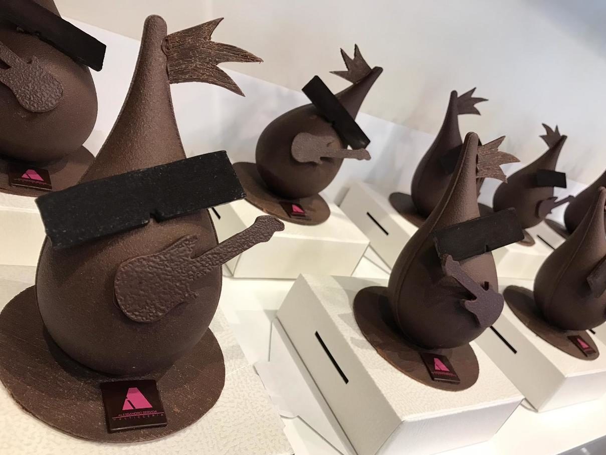 Artistiche, divertenti e anche un po’ irriverenti. Sono queste le uova di Pasqua create da Alessandro Servida per il 2019. Uova che riflettono il suo spirito rock, a partire dalla creazione che lo rappresenta di più: l’uovo spettinato. Proprio come ama definirsi lui, il pasticcere spettinato, questo uovo, realizzato interamente in cioccolato fondente, si distingue per un divertente ciuffo in cioccolato e per la chitarra, che spesso decora i dolci di Servida. Tanto gusto, grazie all’ottimo cioccolato, ma anche divertimento per le tavole pasquali.