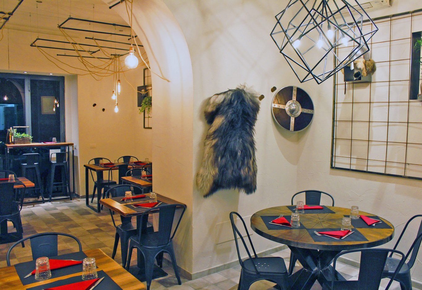 Il design: Dalla Terra di Mezzo di Milano (il cosiddetto mondo sensibile del Miðgarðr) i clienti entrano nel mondo sospeso del Valhalla, che secondo la mitologia è composto di muri fatti con le asce dei guerrieri più valorosi e panche ricoperte di armature e vesti dei combattenti per banchettare con carne di cinghiale, bere idromele e coppe di birra distribuite dalle Valchirie, questa è l’atmosfera evocativa a cui si è ispirato il primo ristorante milanese dedicato al mondo vichingo, a due passi dai Navigli studiato dall’architetto Andrea Murciano e dal designer Giampaolo Morelli.