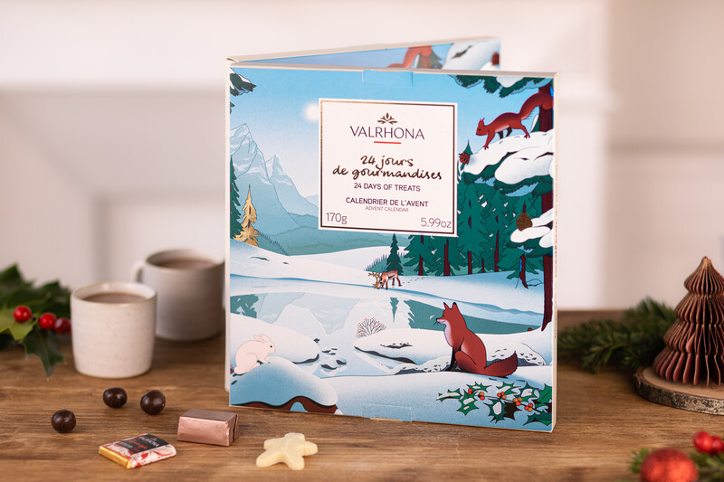 Il conto alla rovescia è iniziato con questo calendario dell’Avvento che offre una selezione di prodotti Valrhona. Ogni casella contiene una deliziosa sorpresa da scoprire: mandorle e nocciole ricoperte di cioccolato al latte o blond Dulcey, Croustibilles al cioccolato fondente o al latte Caramèlia 36%, modellaggi natalizi al cioccolato fondente Caraìbe 66% o bianco Ivoire 35%, croccanti cioccolatini al pralinato fruttato o mandorla e nocciola, carré di cioccolato fondente Guanaja 70% e mini tavolette di cioccolato al latte Jivara 40%. Per aspettare Natale scoprendo giorno per giorno una nuova delizia al cioccolato