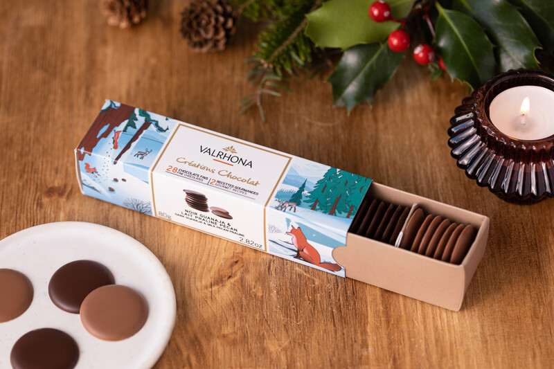 La novità Valrhona di quest’anno è un astuccio con 14 palet di cioccolato, raffinati e deliziosi. Rotondi, morbidi e golosissimi, sono disponibili in due versioni: per gli amanti del cioccolato fondente l’iconico Guanaja 70%, e per gli amanti del latte una declinazione di cioccolato al latte con noci pecan.