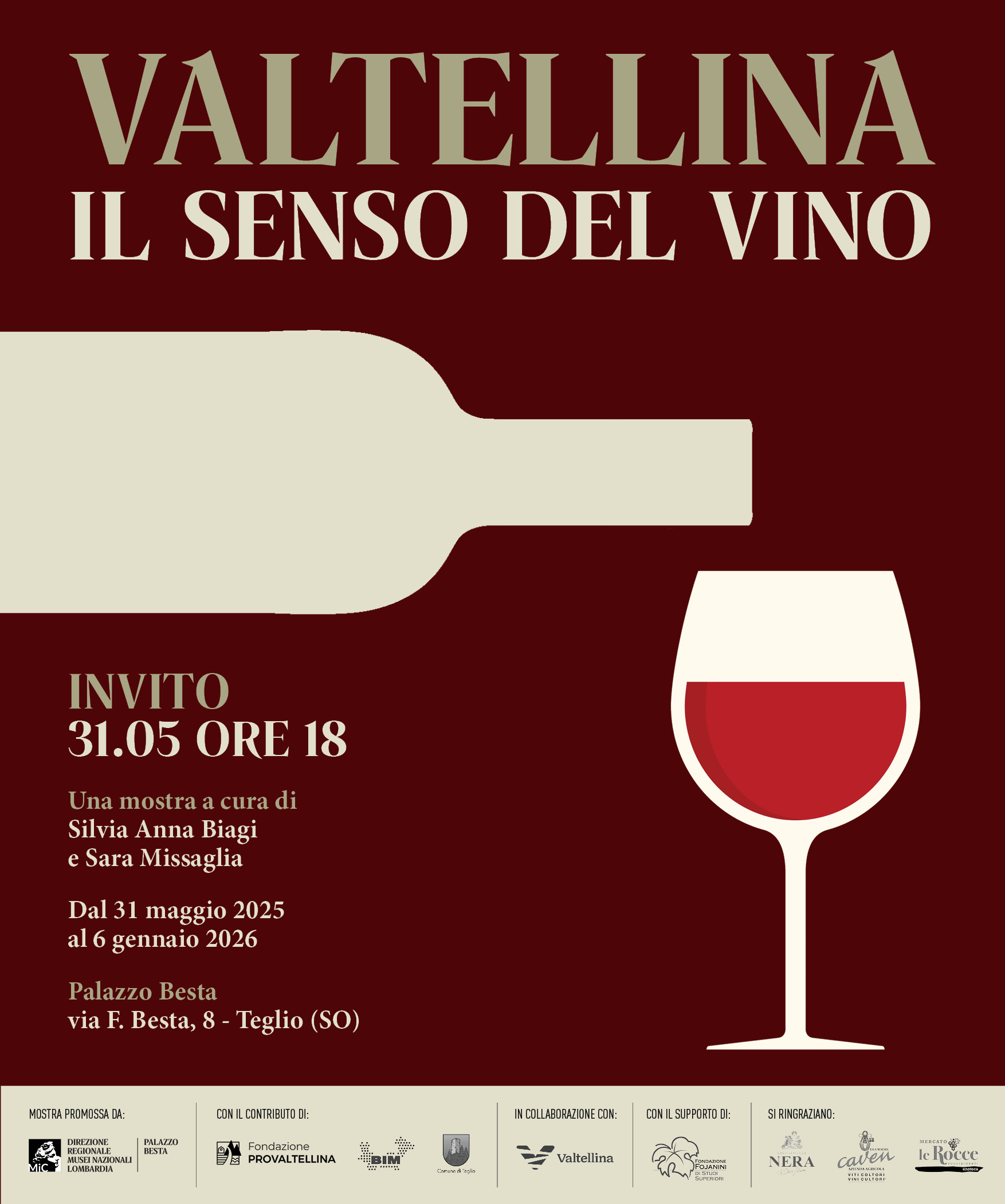 Sabato 31 maggio 2025 si è aperta al pubblico, nella straordinaria cornice di Palazzo Besta a Teglio (SO), la mostra “Valtellina. Il senso del vino”, un inedito percorso espositivo dedicato al profondo legame tra il vino e il territorio della Valtellina. Un progetto a cura della Direzione Regionale Musei Lombardia (Ministero della Cultura), sviluppato da un’idea di Sara Missaglia e Giusi di Gangi e finalizzato con la direzione di Silvia Anna Biagi, direttrice di Palazzo Besta. La curatela scientifica è affidata a Sara Missaglia, giornalista, wine educator e sommelier.