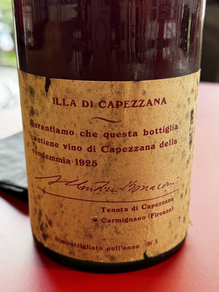 Villa di Capezzana Carmignano 1925 prima annata prodotta: sull’etichetta questa frase “Garantiamo che questa bottiglia contiene vino di Capezzana della vendemmia 1925”. Sicuramente non un calice di facile approccio, lasciamo perdere tutti i normali descrittori, con lui si va oltre. Bere un vino di 100 anni è un’esperienza più unica che rara, ancora fresco, esile, delicato e affascinante. Un’emozione difficile da riportare a parole…un calice che si degusta in religioso silenzio per apprezzarne ogni sfumatura. Di questo primo millesimo ancora 29 bottiglie custodite gelosamente nelle cantine della Tenuta.