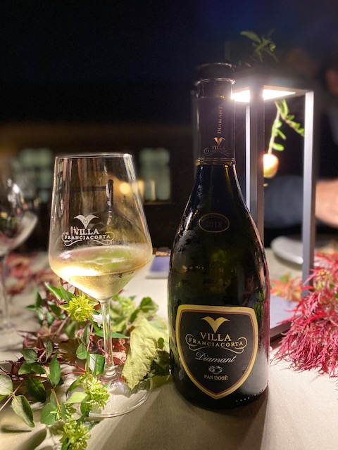 Ecco che si fa sera, le luci si abbassano ed entra in scena Diamant Franciacorta pas dosè mill. 2018 Chardonnay 85%, Pinot nero 15% con un affinamento sui lieviti per almeno 60 mesi. Rappresenta la massima espressione del terroir da cui proviene: intenso e ricco al naso, sentori di frutta gialla matura, fiori gialli, note agrumate e tocchi di pasticceria. Sorso pieno e sapido, colpisce per struttura, equilibrio e persistenza. Abbinato a un crostone con salsa tonnata, acciughe di Cantabrico e nocciole, tavolozza dell’orto con zucchina ripiena, torretta di melanzane, peperone ripieno, cuore di porro e bacon, polenta e gorgonzola.