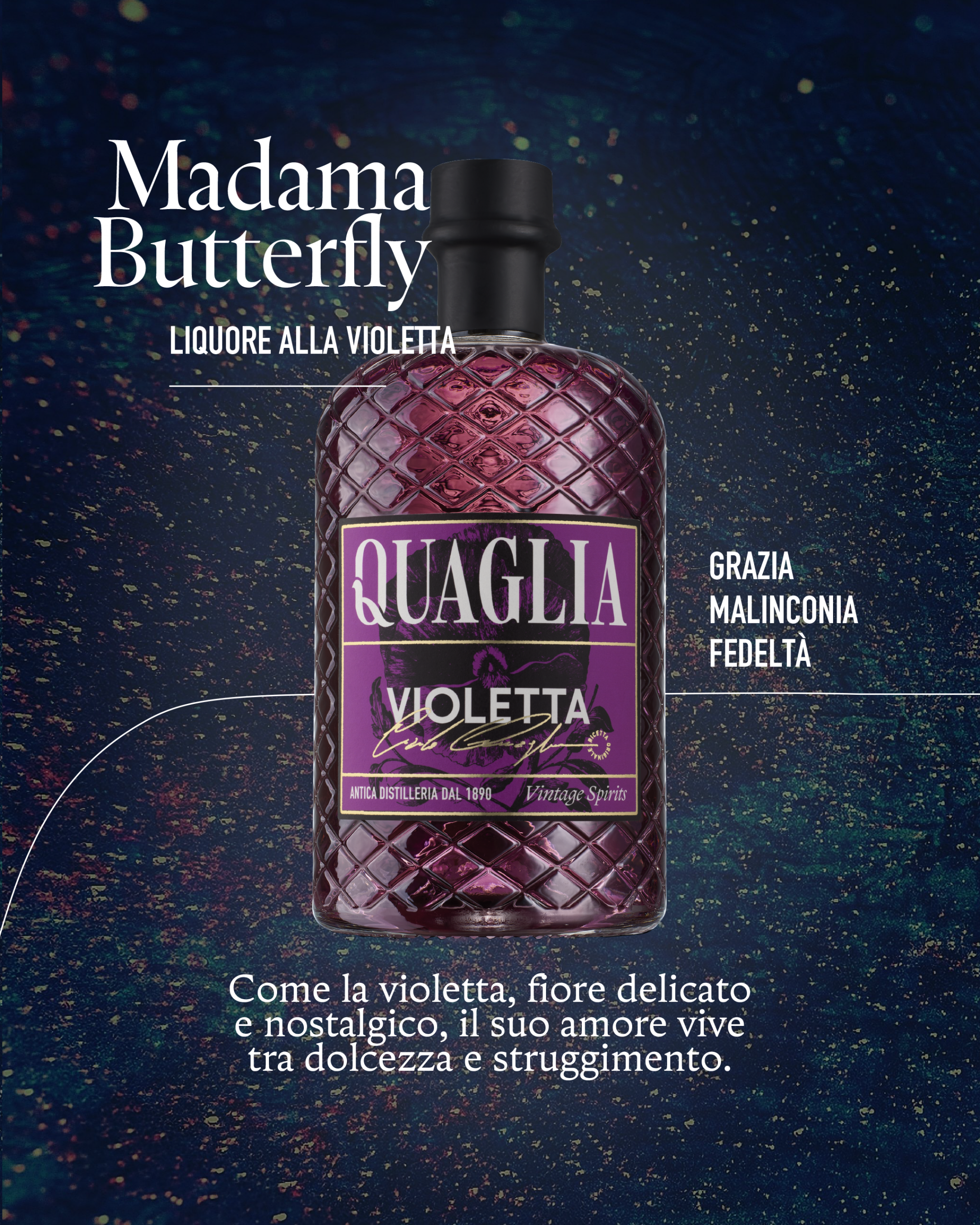 – Madame Butterfly realizzato con liquore alla violetta fiore delicato e nostalgico richiama alla protagonista e al suo amore che vive fra dolcezza e struggimento.