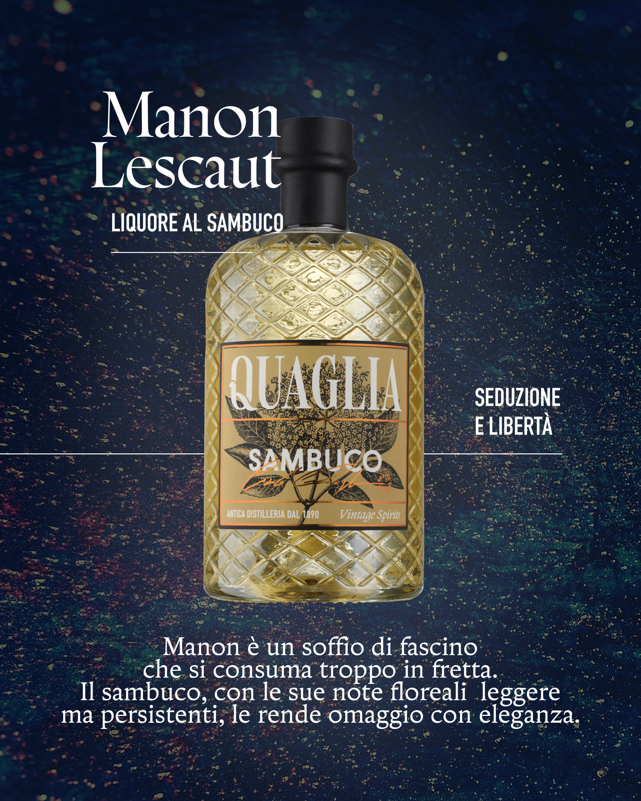 – Manon Lescaut realizzato con liquore al sambuco riporta con le sue note floreali leggere e persistenti alla protagonista e le rende omaggio con eleganza.
