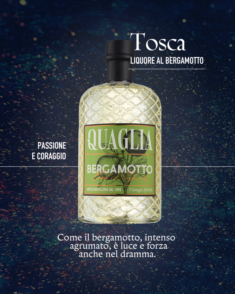 –       Tosca realizzato con liquore al bergamotto richiama con il suo gusto intenso agrumato la luce e la forza che sottendono a questa opera.